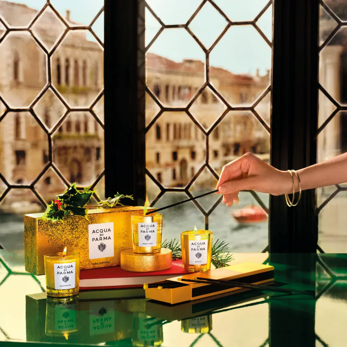 Celebra la audacia y la vitalidad con este set de regalo de edición limitada compuesto por velas aromáticas con fragancias diseñadas para transmitir la alegría de las fiestas de fin de año. El fascinante aroma de las coníferas y la faceta verde de las agujas de pino heladas de la vela Bosco captura la esencia de un bosque mágico; Panettone lleva a tu hogar el icónico aroma de este bizcocho tradicional milanés con notas cítricas y dulces de vainilla y fruta confitada; y la calidez reconfortante de Caminetto sublimará tus ambientes con notas de incienso y acogedores toques de ámbar. Sublima el ambiente de tu hogar y cautiva a tus invitados con la exquisita luz de estas velas, que transmiten la magia de las fiestas de fin de año.