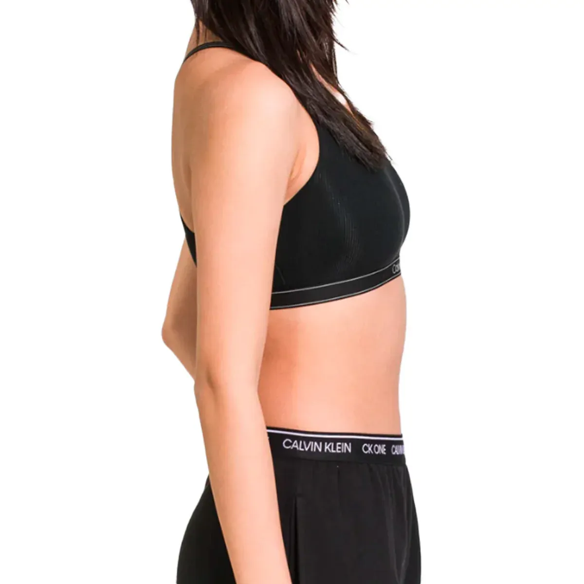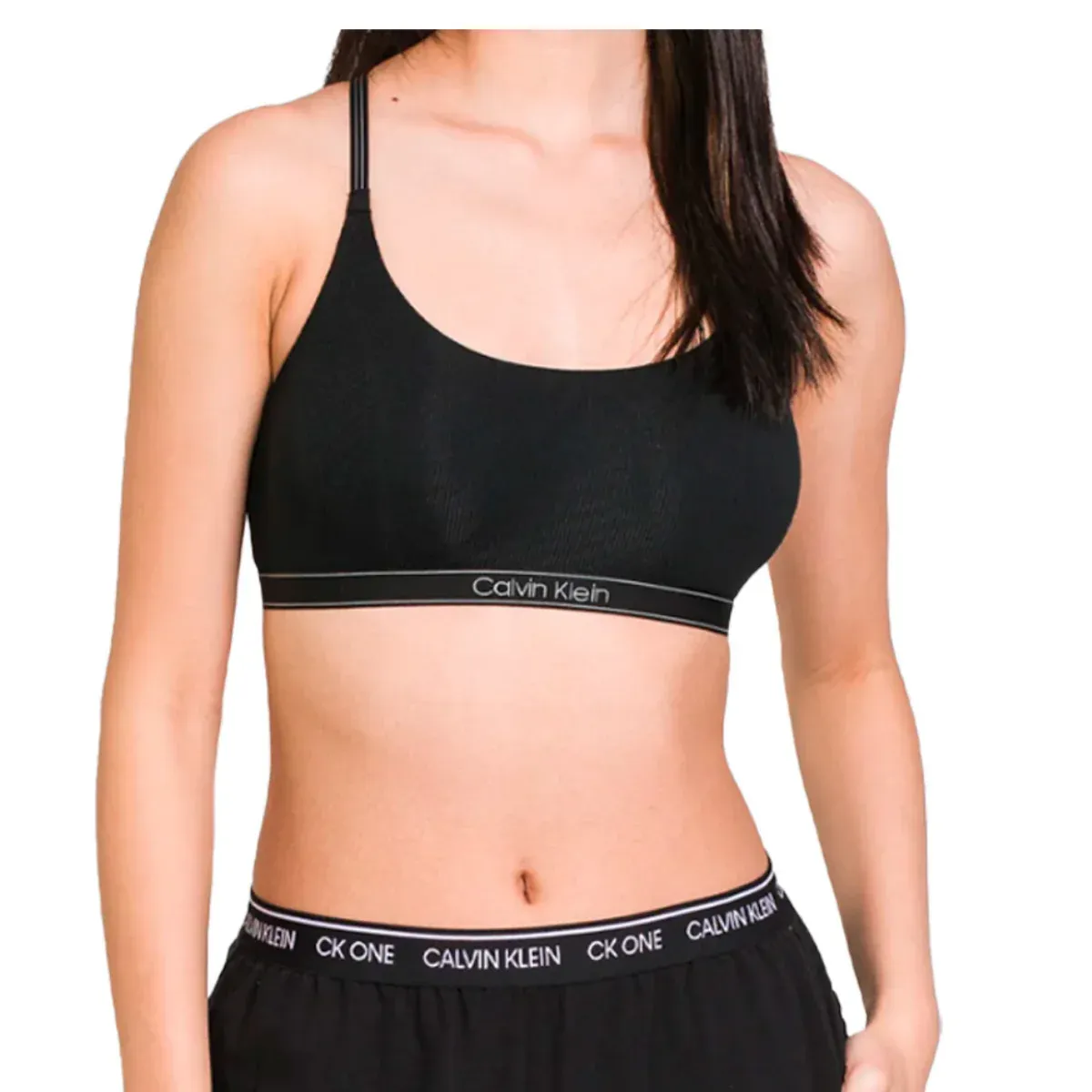 Este brasier de Calvin Klein es una prenda de ropa interior que se destaca por su banda elástica de apoyo debajo del pecho con estampados de logotipos de la marca.