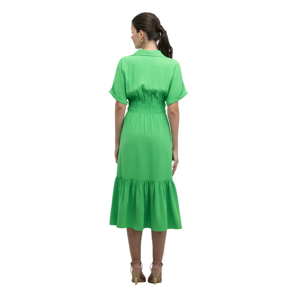 VESTIDO CAMISERO LARGO DE CUELLO EXTENDIDO MANGAS CORTAS CON DOBLADILLO ABOTONADO FRONTAL DOBLE ELASTICO EN CINTURA VERDE LISO 100% POLYESTER