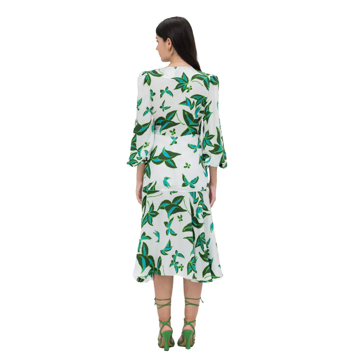 VESTIDO LARGO CORTE V MANGAS LARGAS CON ELASTICO EN PUÑOS CIERRE CON LAZO VERDE ESTAMPADO MARIPOSA 100% POLYESTER
