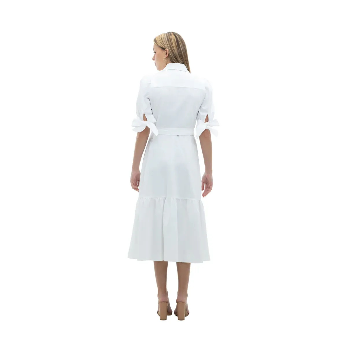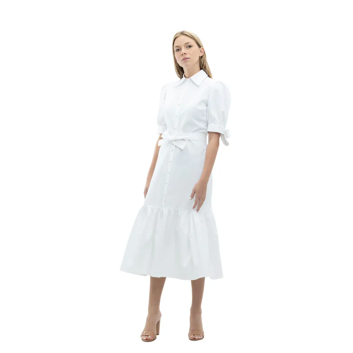 VESTIDO CAMISERO LARGO MANGAS CORTAS CON LAZO ABOTONADO FRONTAL ACOMPAÑADO DE CINTURON BLANCO LISO 63% COTTON 31% NYLON 6% SPANDEX