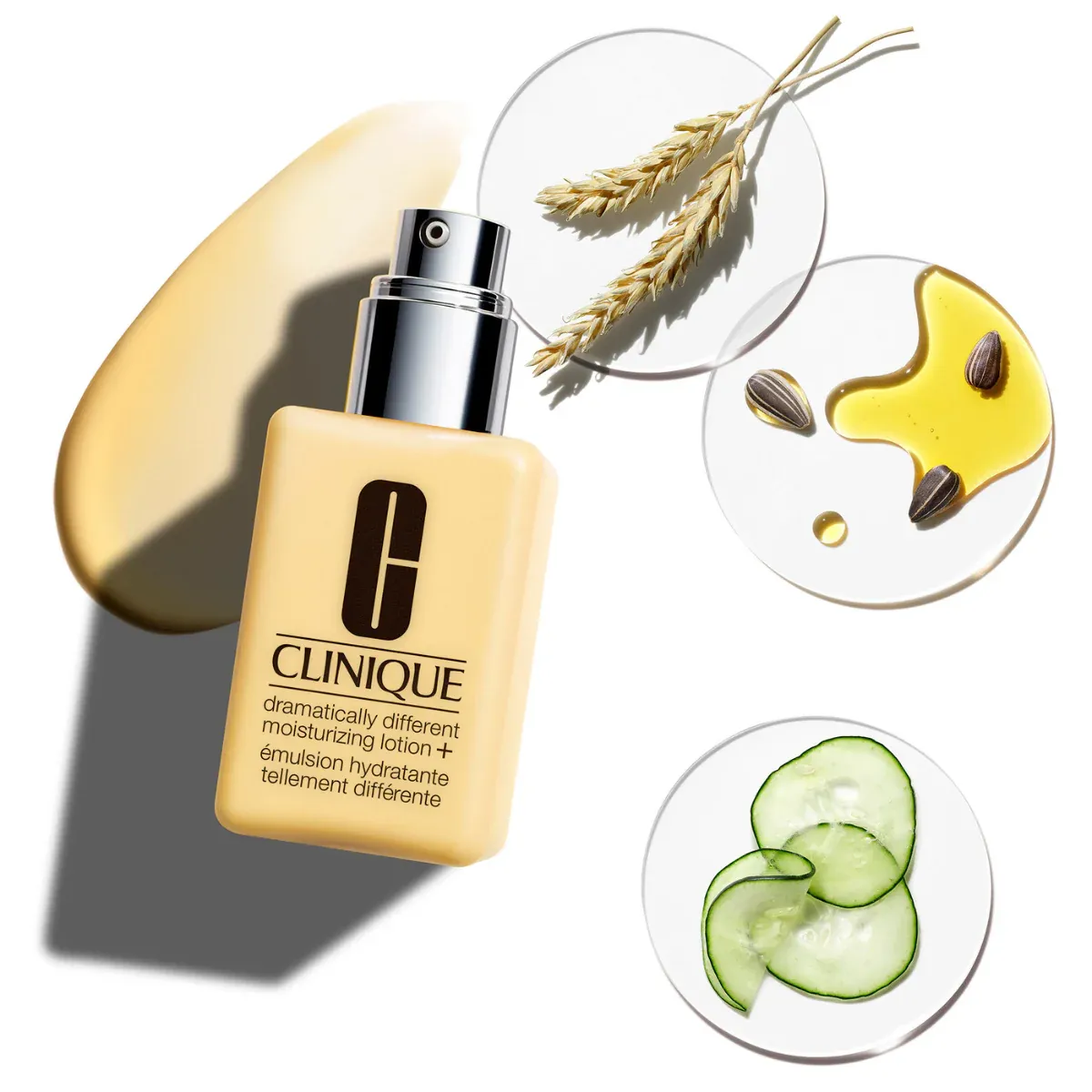 Clinique Dramatically Different Moisturizing Lotion+ Tipos de piel: 1, 2 ¿Qué es? Es el Paso 3 en nuestro Sistema de 3 Pasos personalizado para el cuidado de la piel. El hidratante facial, desarrollado por dermatólogos, suaviza y mejora la piel dejando la piel saludable. El hidratante amarillo hidrata por todo el día. Se esparce fácilmente, se absorbe rápidamente. Ayuda a fortalecer la propia barrera de humedad de la piel, para que quede más hidratada. La piel que retiene más humedad luce más joven y saludable. Nuestra filosofía de pureza Sin parabenos. Sin ftalatos. Sin fragancia. Piel simplemente feliz. Cómo se usa. Usa dos veces al día, por la mañana y noche. Aplica en todo el rostro y cuello o donde se necesite. La piel limpia y exfoliada acepta mejor la humectación. Para mejores resultados, aplica después de los pasos 1 y 2 de nuestro Sistema de 3 Pasos. Un poquito rinde mucho. Masajea una aplicación de loción en la piel, donde quiera que esté seca.