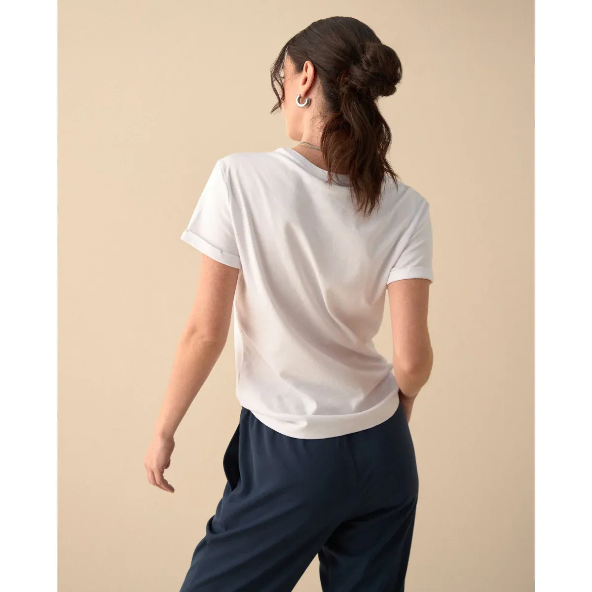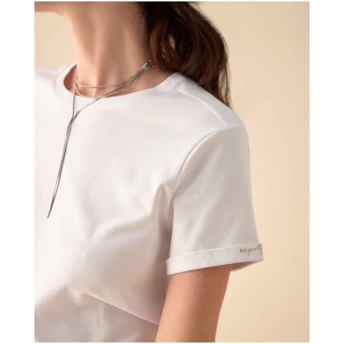 La camiseta que todo armario necesita. Su diseño de manga corta, cuello redondo y silueta tradicional se convierte en la base perfecta para crear looks sencillos o combinaciones más elaboradas. Tan básica como versátil.