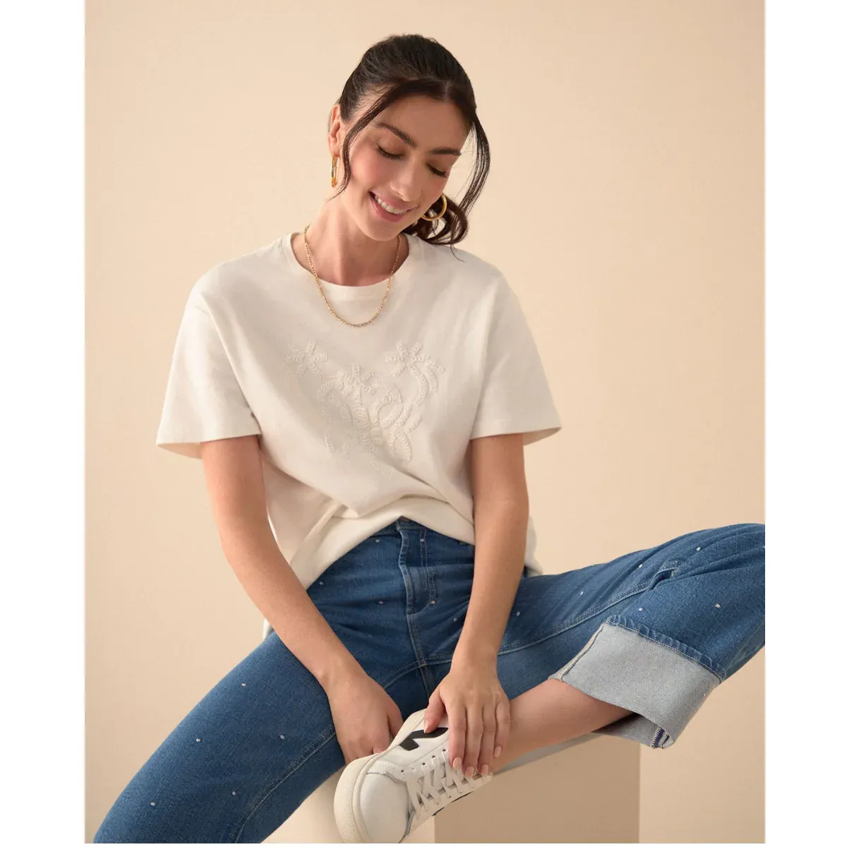 Sutil y sofisticada. Su bordado tono a tono en el frente y el tacto suave de la tela la hacen tu aliada perfecta para un look relajado con un toque especial.
