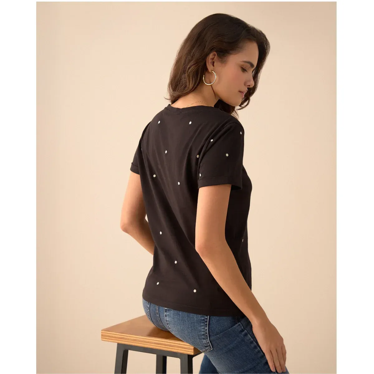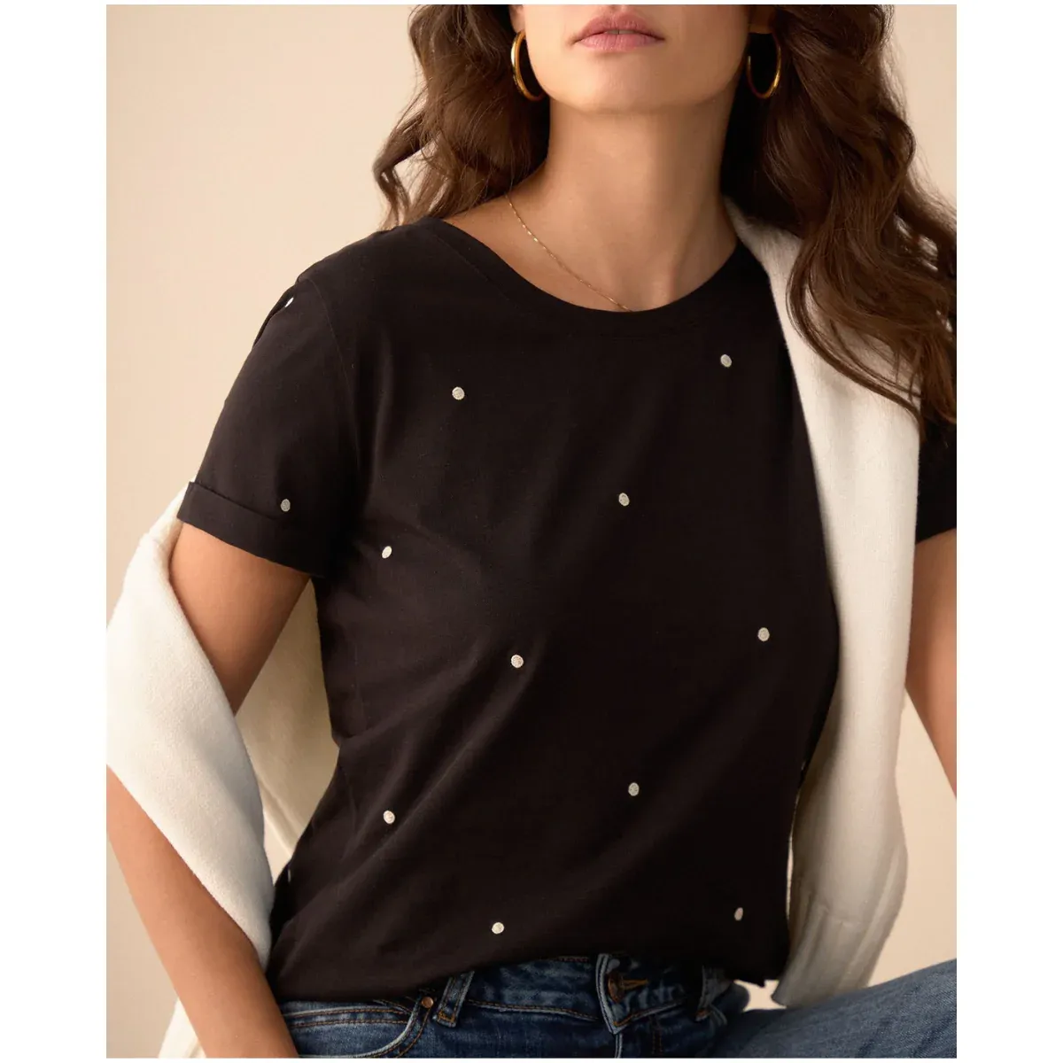 Una prenda que combina delicadeza y frescura. El diseño de puntos en esta camiseta de manga corta aporta dinamismo y suavidad a tus días, mientras que su cuello redondo y silueta tradicional hacen que sea fácil de combinar.