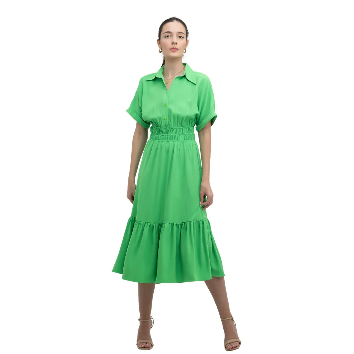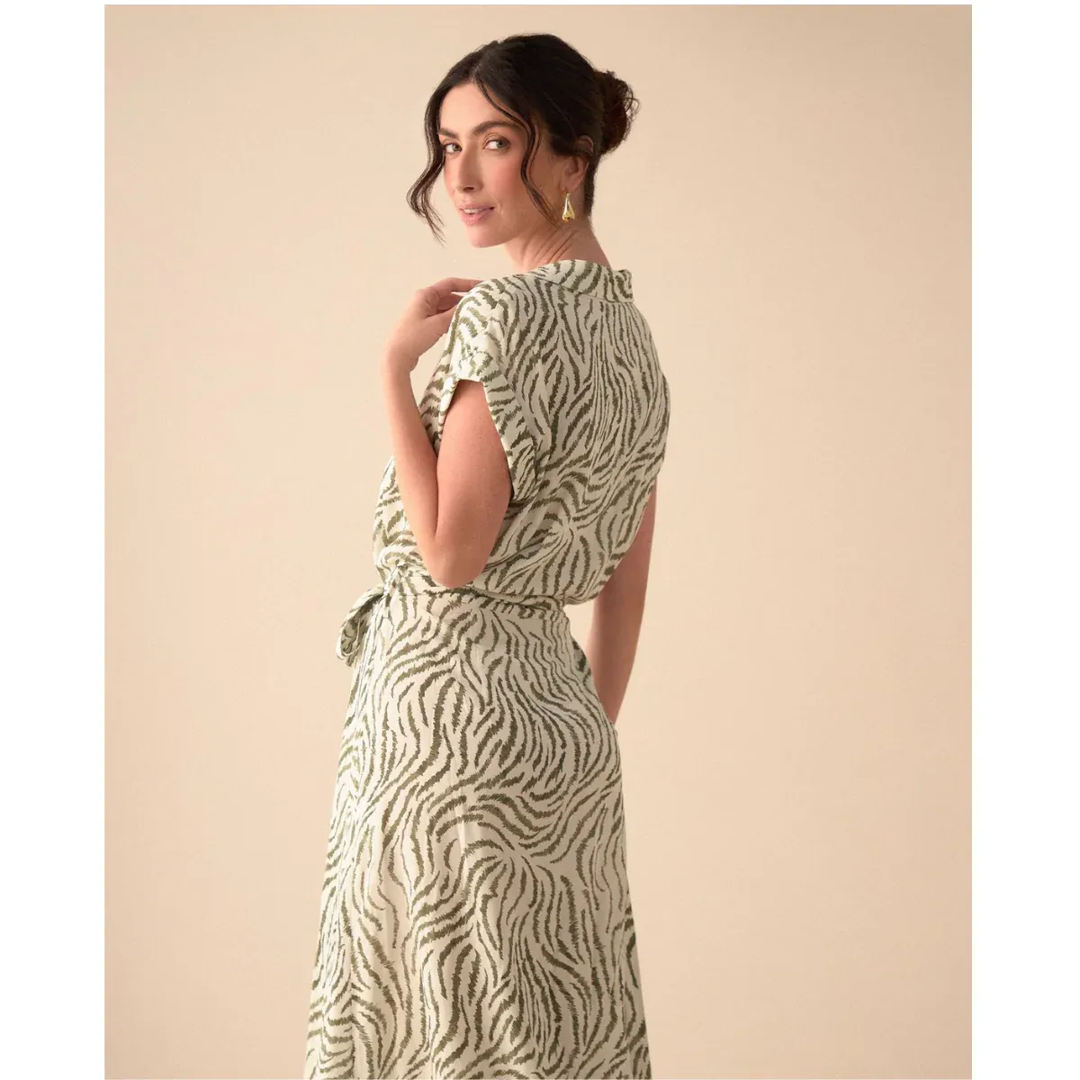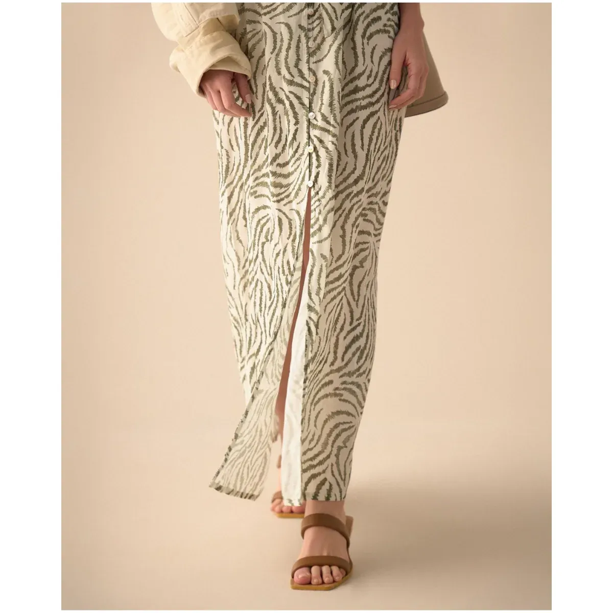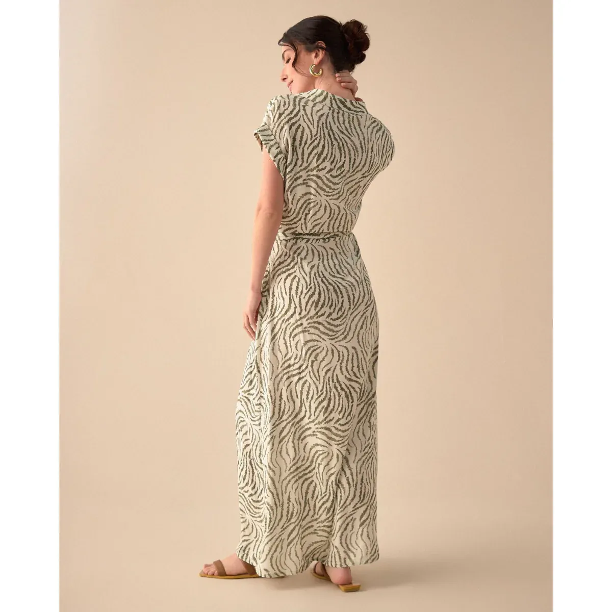 Fluye con gracia. Este vestido largo con cuello clásico en V y manga sisa rodada presenta un estampado único, botones delanteros y una abertura frontal, acompañado de un cinturón en la misma tela para un ajuste perfecto.