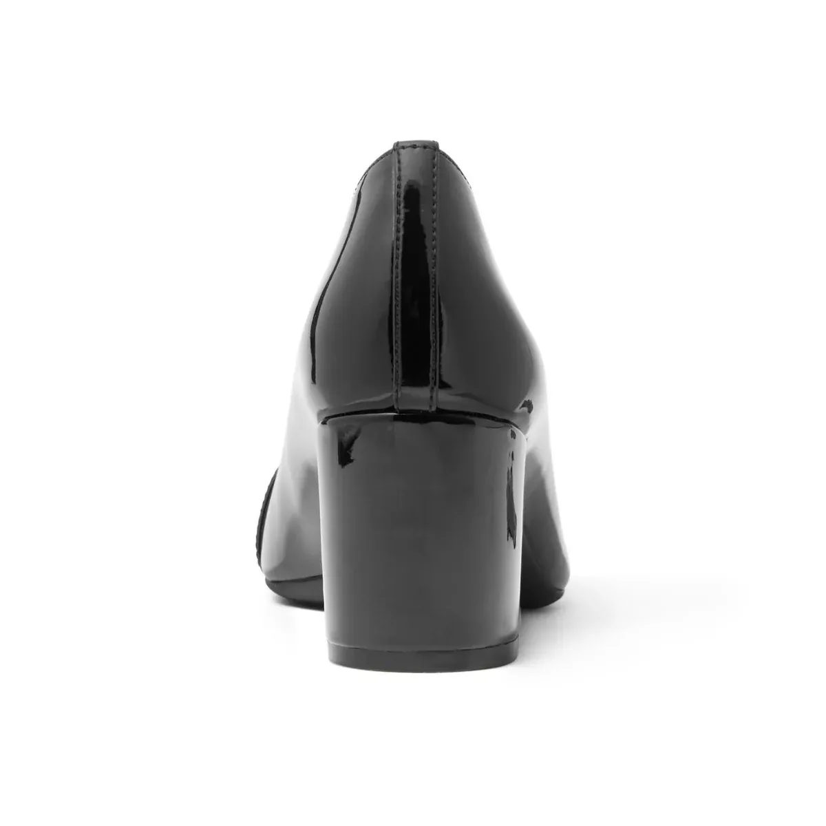Zapato de tacón acharolado con la placa del logo en todo dorado. Cuenta con puntera redonda y tacón cuadrado.