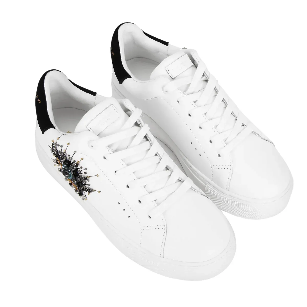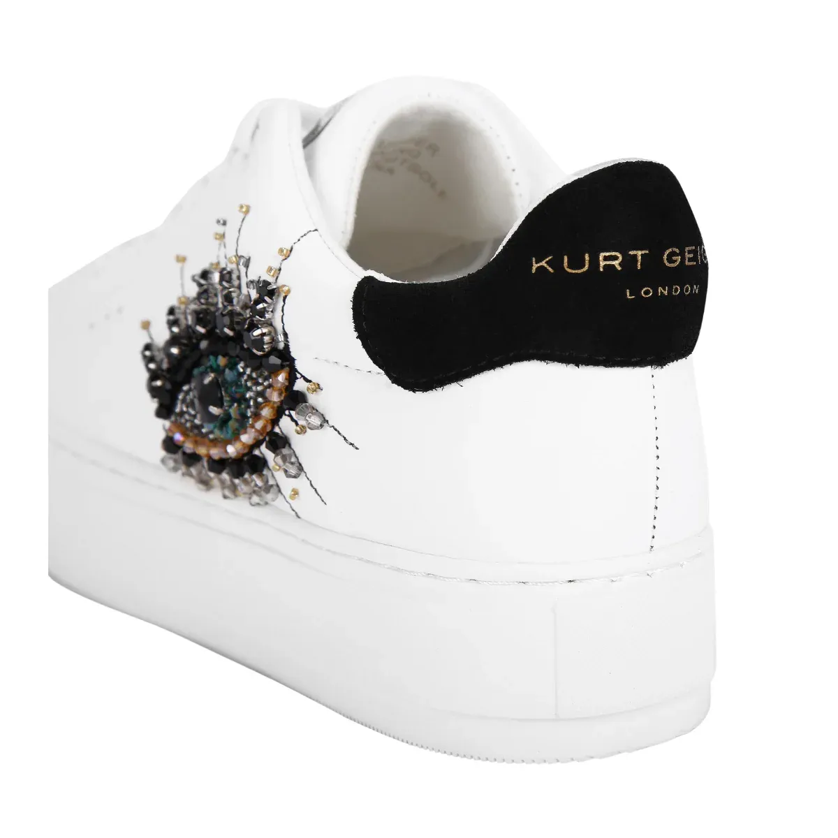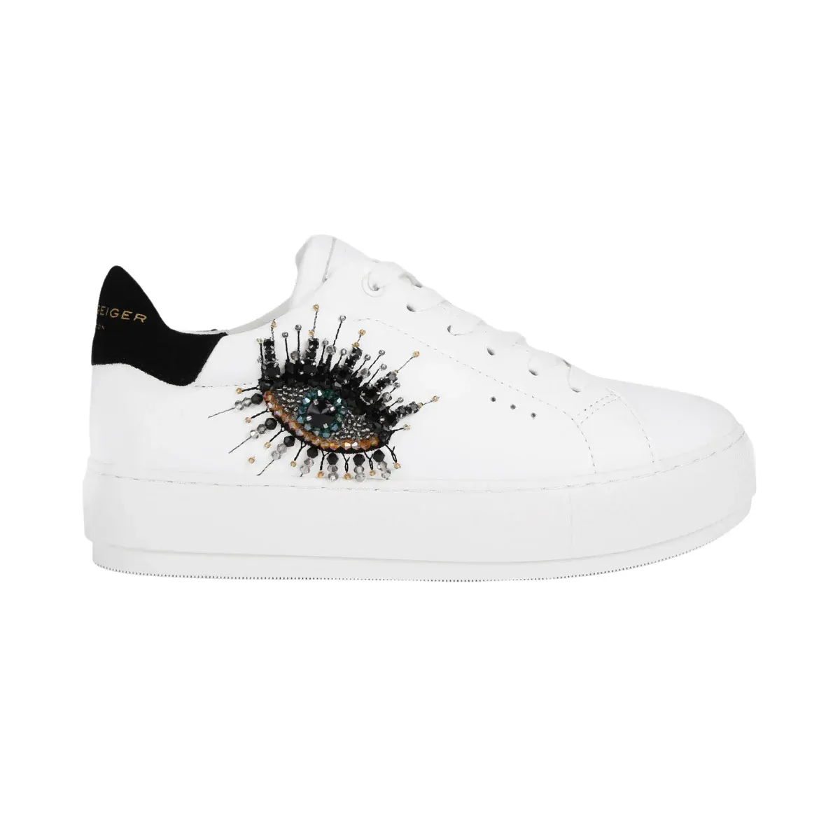 La zapatilla Laney Eye está hecha de cuero blanco. A un costado, cuenta con un motivo de ojo que consta de múltiples cristales. El talón tiene acabado de gamuza negra con el logotipo en lámina de oro. Altura de la suela: 3,5cm. Este estilo encaja pequeño, le recomendamos que tome una talla más.