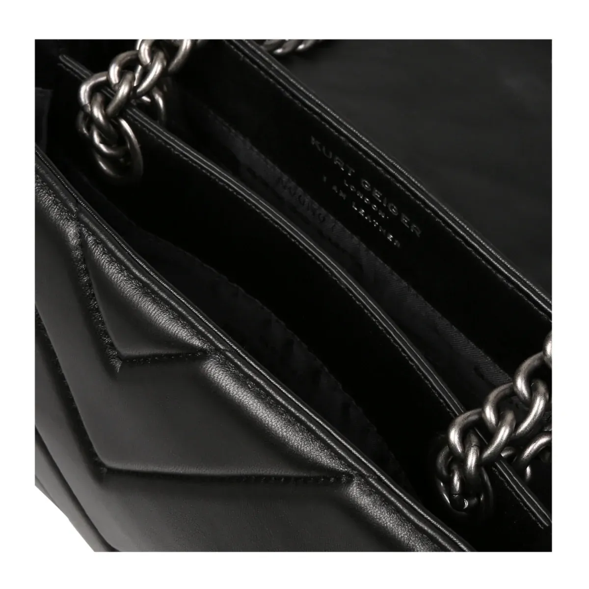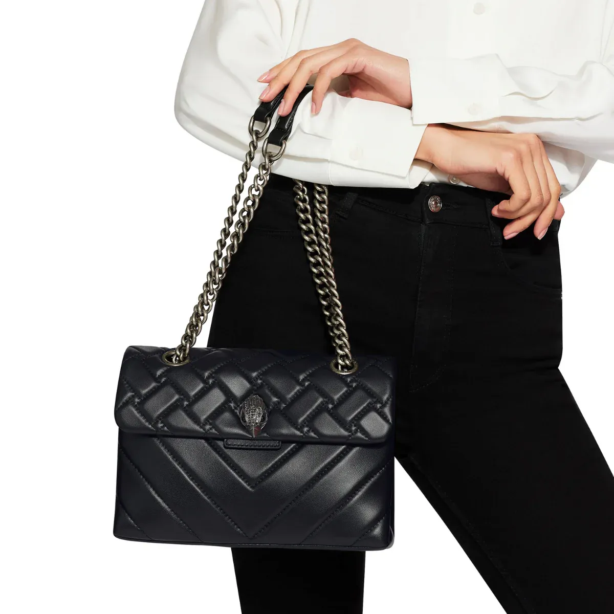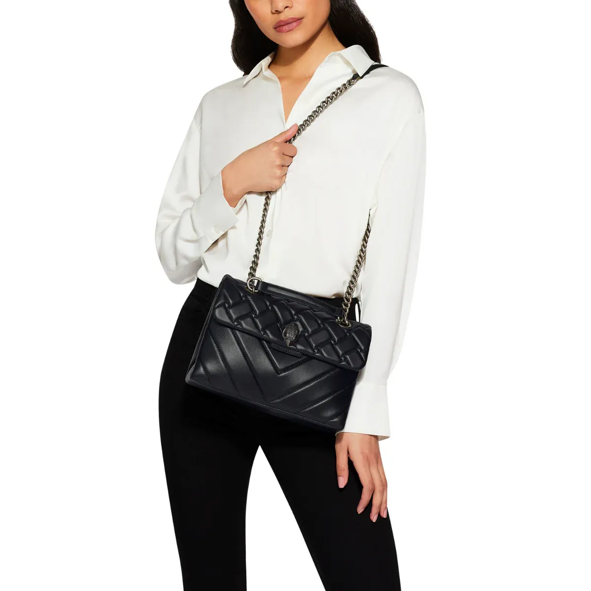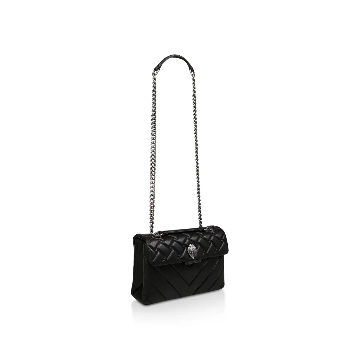 El bolso de cuero Kensington está confeccionado en suave cuero de cordero que combina patrones de tejido y Chevron. La cabeza de águila en plata envejecida presenta cristales plateados opacos y ojos de cristal negro en la solapa frontal. Medidas: 17 cm (alto), 25.9 cm (largo), 7.9 cm (profundidad). Caída de la correa cruzada: 111 cm. Caída de la correa para hombro: 64 cm. Correa de cadena en plata envejecida con dos inserciones acolchonadas de cuero. Cierre magnético dúo oculto bajo la solapa. Logo en foil plateado en la parte trasera. Capacidad para teléfonos de hasta 7 pulgadas. Dos compartimentos interiores con pequeño bolsillo interno forrado. Exterior: Cuero de cordero. Interior: Forro interior con monograma.