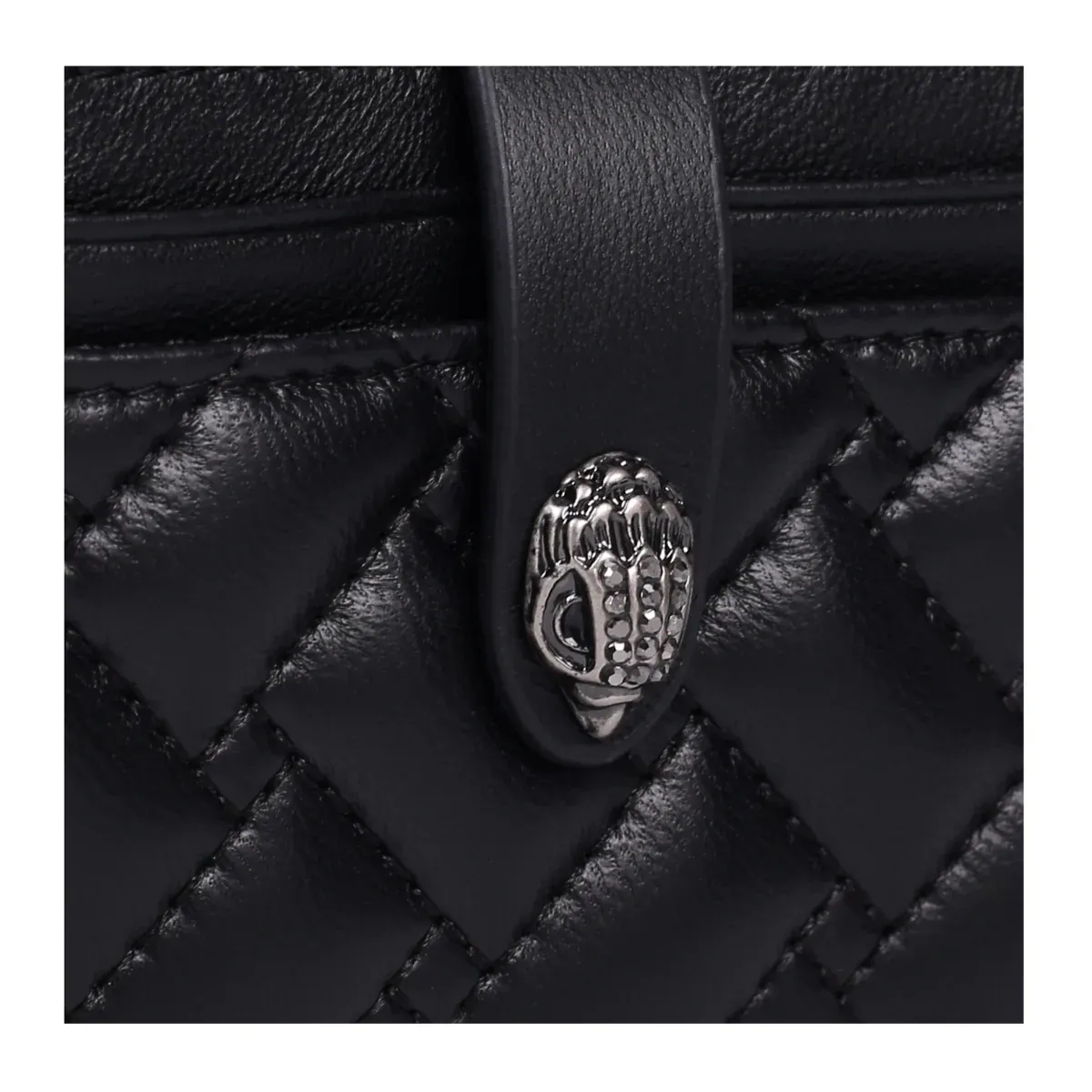 El portatarjetas múltiple está confeccionado en suave cuero de cordero con acolchado en sobrecostura en un patrón de tejido. La cabeza de águila en plata envejecida cuenta con cristales plateados opacos y ojos de cuentas negras, y se encuentra en el cierre. Medidas: 7.9 cm (alto), 10.4 cm (largo), 0.8 cm (profundidad). Cierre con botón a presión único. Logo en relieve con foil plateado en el interior. Capacidad para hasta ocho tarjetas clásicas. Exterior: Cuero de cordero. Interior: Forro de cuero sintético.