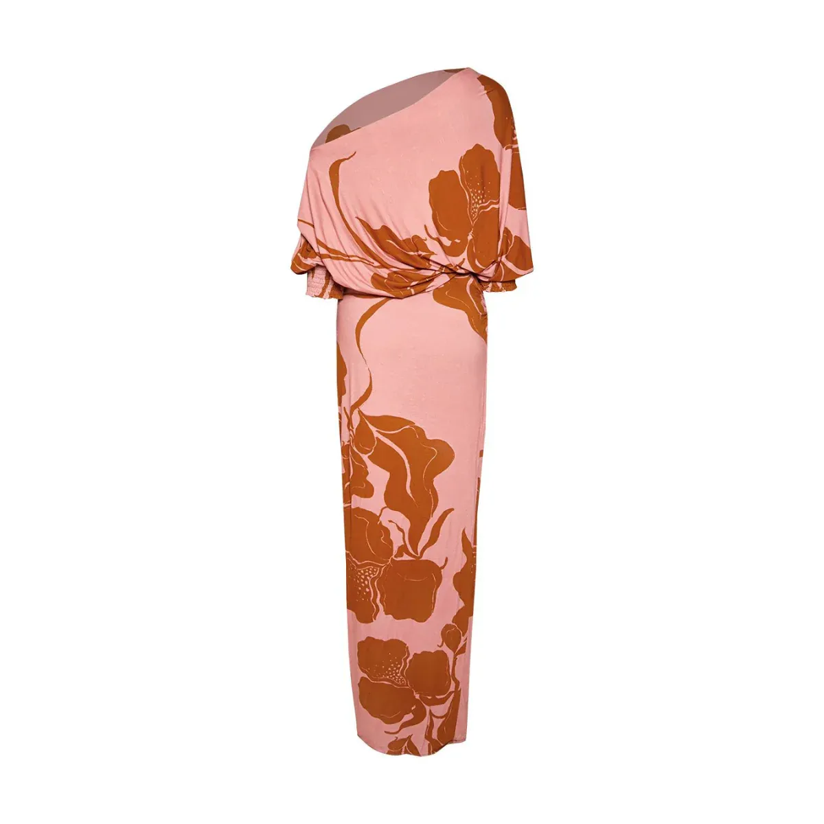 Vestido con superior asimetrico y falda con ruche que permite acentuar la figura. En un estampado floral en tonos tierra y rosa, elaborado en 96% poliamida y 4% elastano