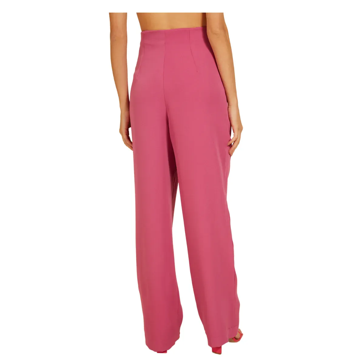 El pantalón presenta cintura alta, abertura frontal con botones plisados, pinzas traseras y dobladillo inferior con acabado sencillo.