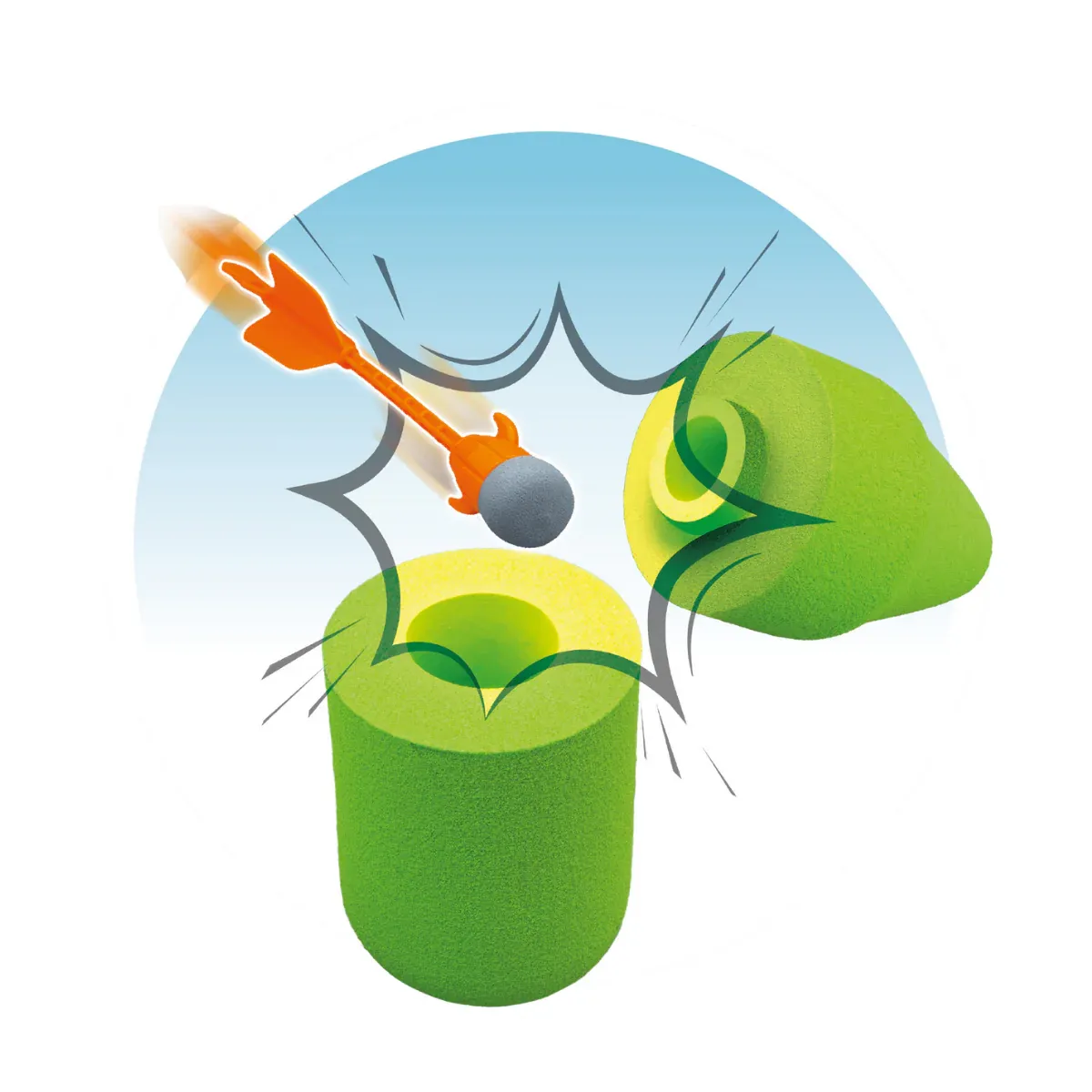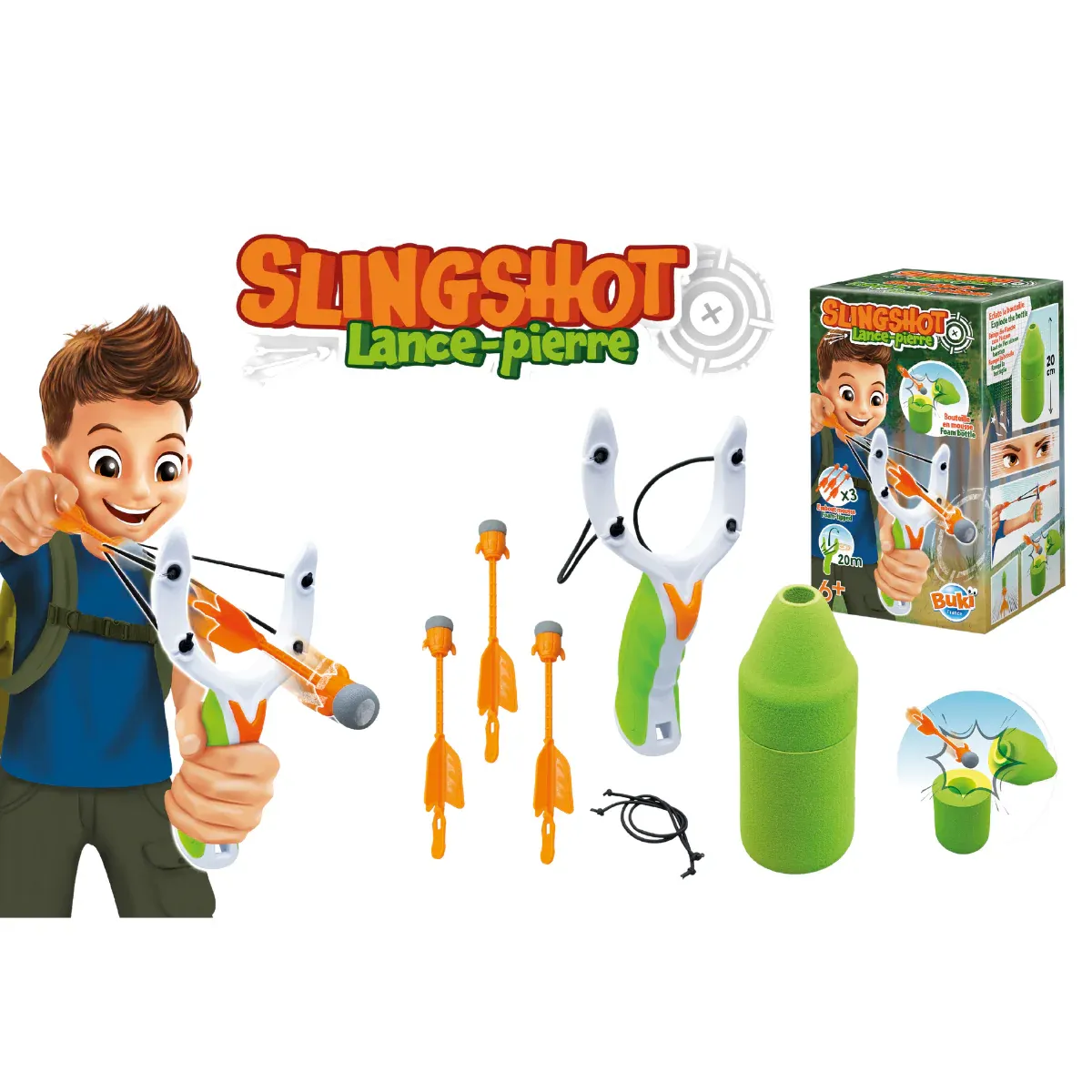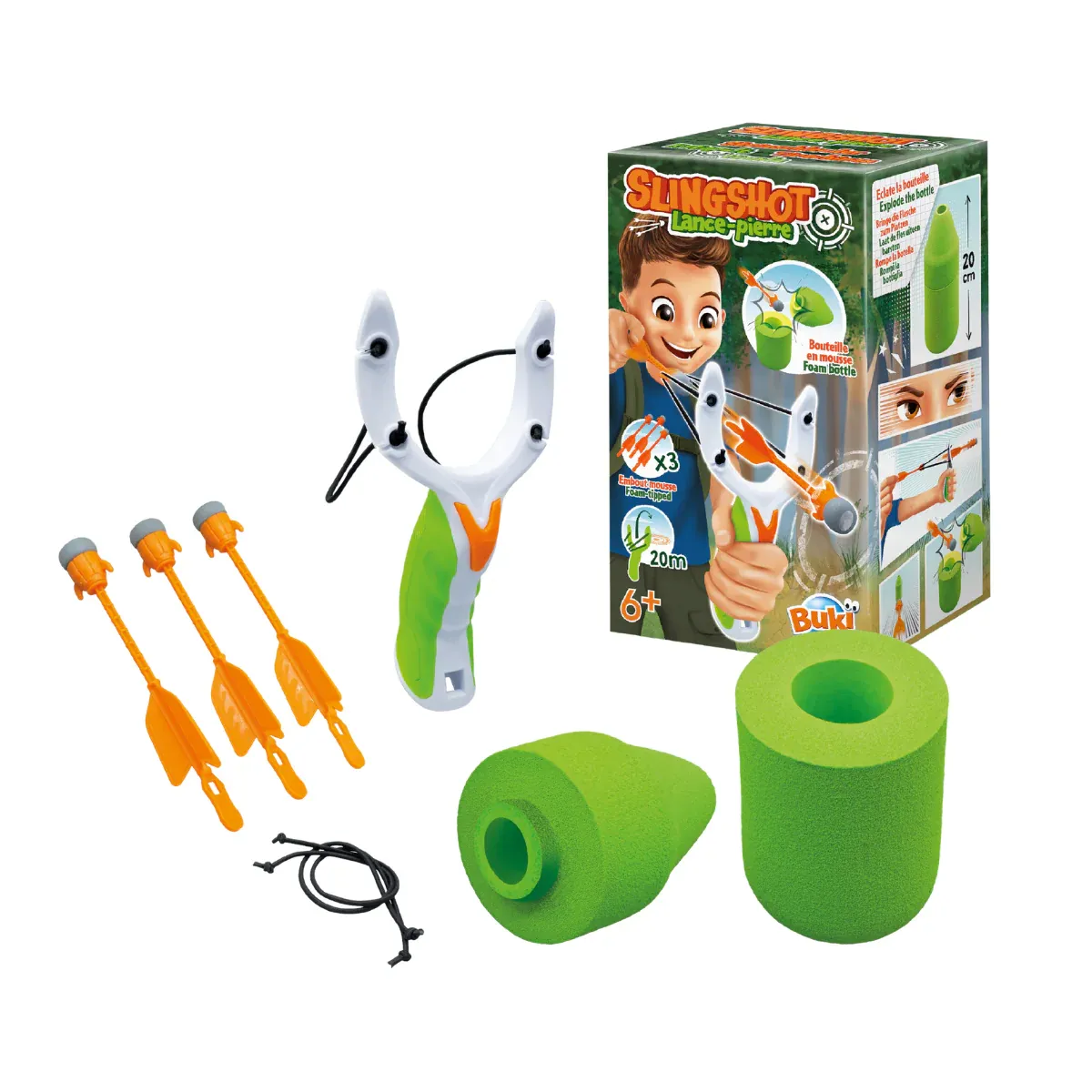 Una resortera segura para sobrevivir en el bosque Dardo con punta de espuma incluidos Apunta la botella de espuma incluida, ¡y dispara! Alcance: 20 m Incluido: 3 proyectiles seguros y gomas elásticas de recambio. Usar únicamente en el exterior. Diseño ligero y portátil. A partir de los 6 años