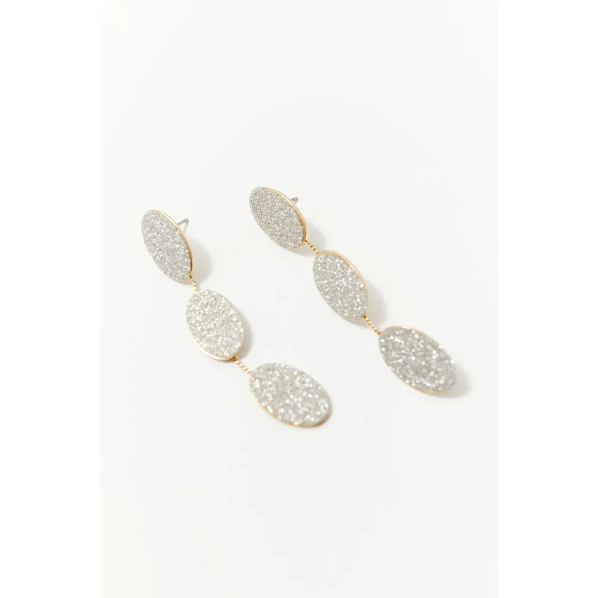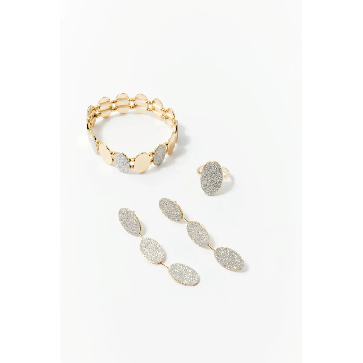 Conjunto de collar, pendientes largos y anillo con purpurina metalizada