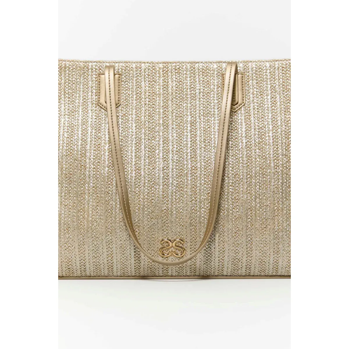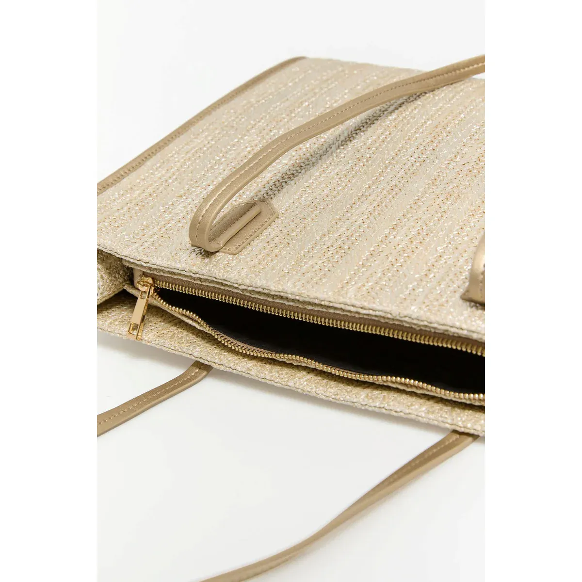 Bolso formato shopper en rafia. Detalle de logo metálico. Cierre mediante cremallera.