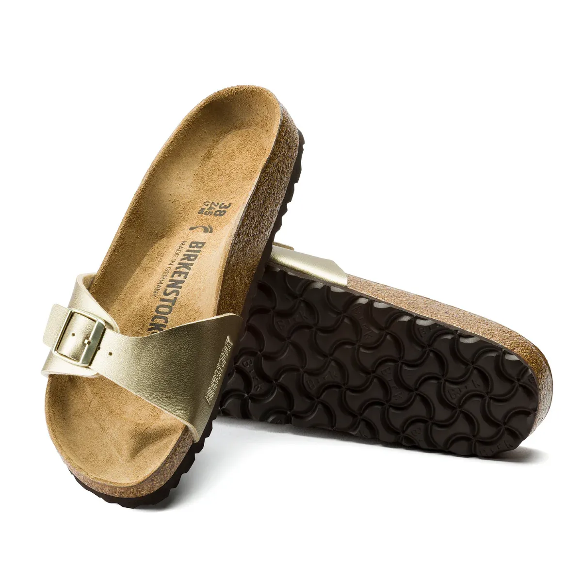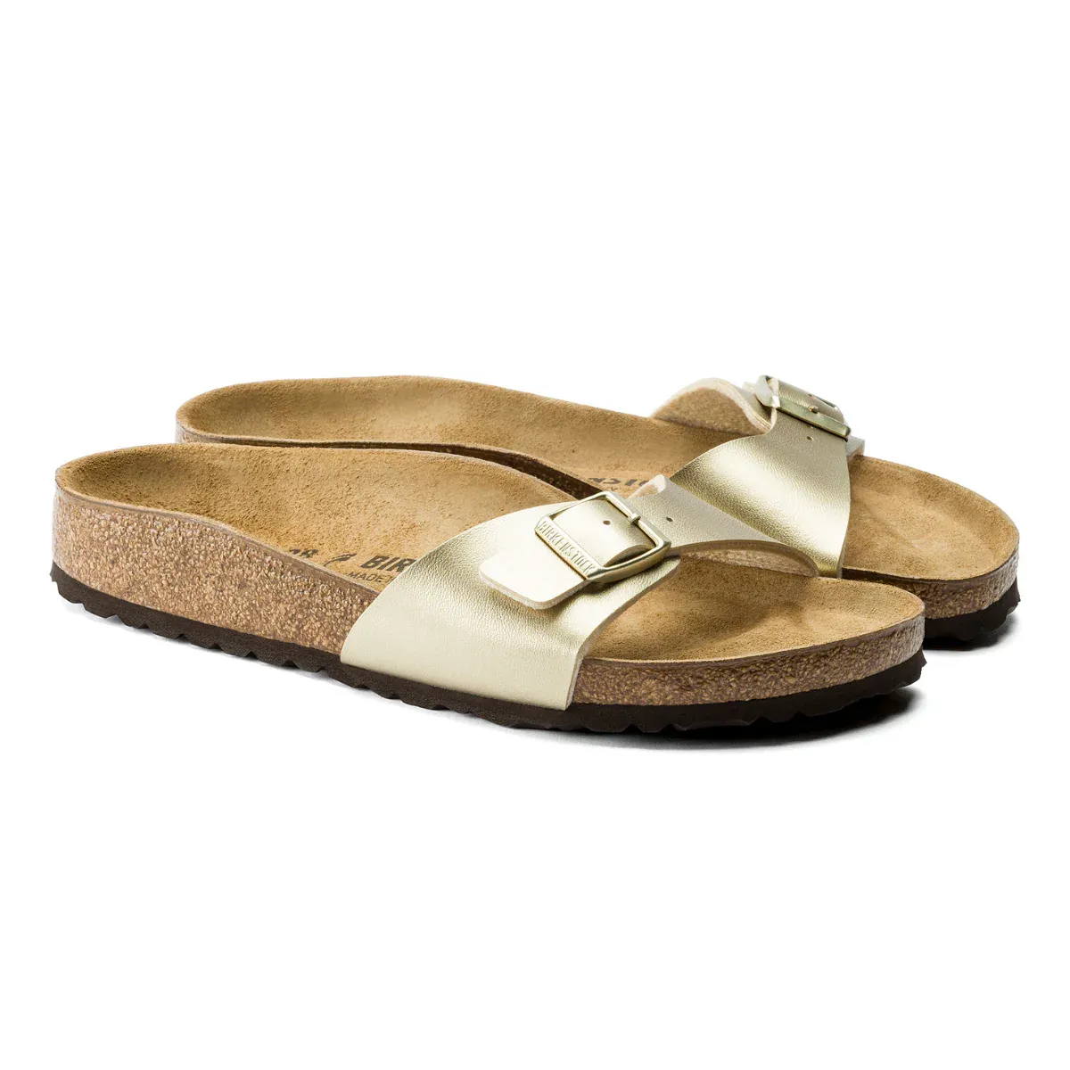 El modelo Madrid de Birkenstock es el miembro más antiguo de la familia, lo que le ha consagrado como un auténtico clásico. Lanzado hace medio siglo como «sandalia de gimnasia», este modelo purista de una correa se convirtió hace ya mucho tiempo en un complemento con mucho estilo. En esta versión destaca por el efecto de brillo metálico. El material superior está compuesto por Birko-Flor, un material sintético resistente y respetuoso con la piel. Plantilla de corcho y látex de forma anatómica. Material superior: Birko-Flor Capa superior de la plantilla: ante. Suela: EVA. Detalles: correa con una hebilla de espiga metálica con ajuste individual. “Hecha en Alemania”