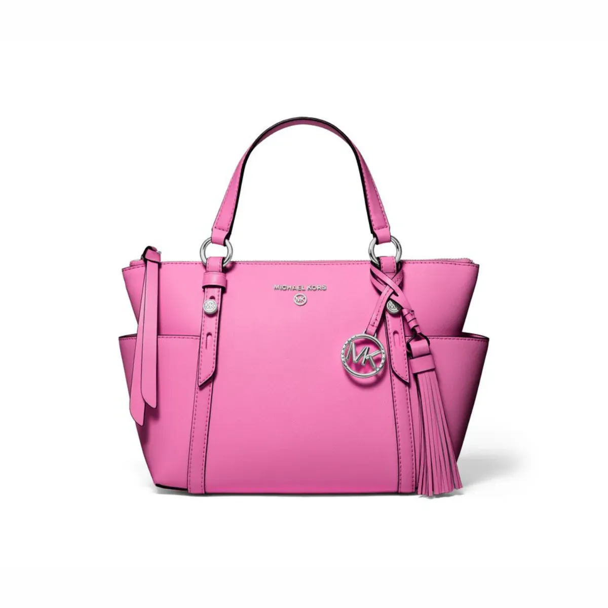 Con dos bolsillos laterales exteriores, para un fácil acceso a lo esencial, y una correa cruzada extraíble, el bolso de mano con cremallera superior Sullivan es un bolso de mano ideal. Los herrajes en tono plateado y el cuero Saffiano se combinan para lograr un efecto de lujo, mientras que un colgante extraíble con el logotipo proporciona un toque final exclusivo.